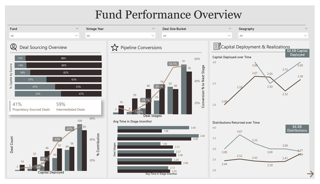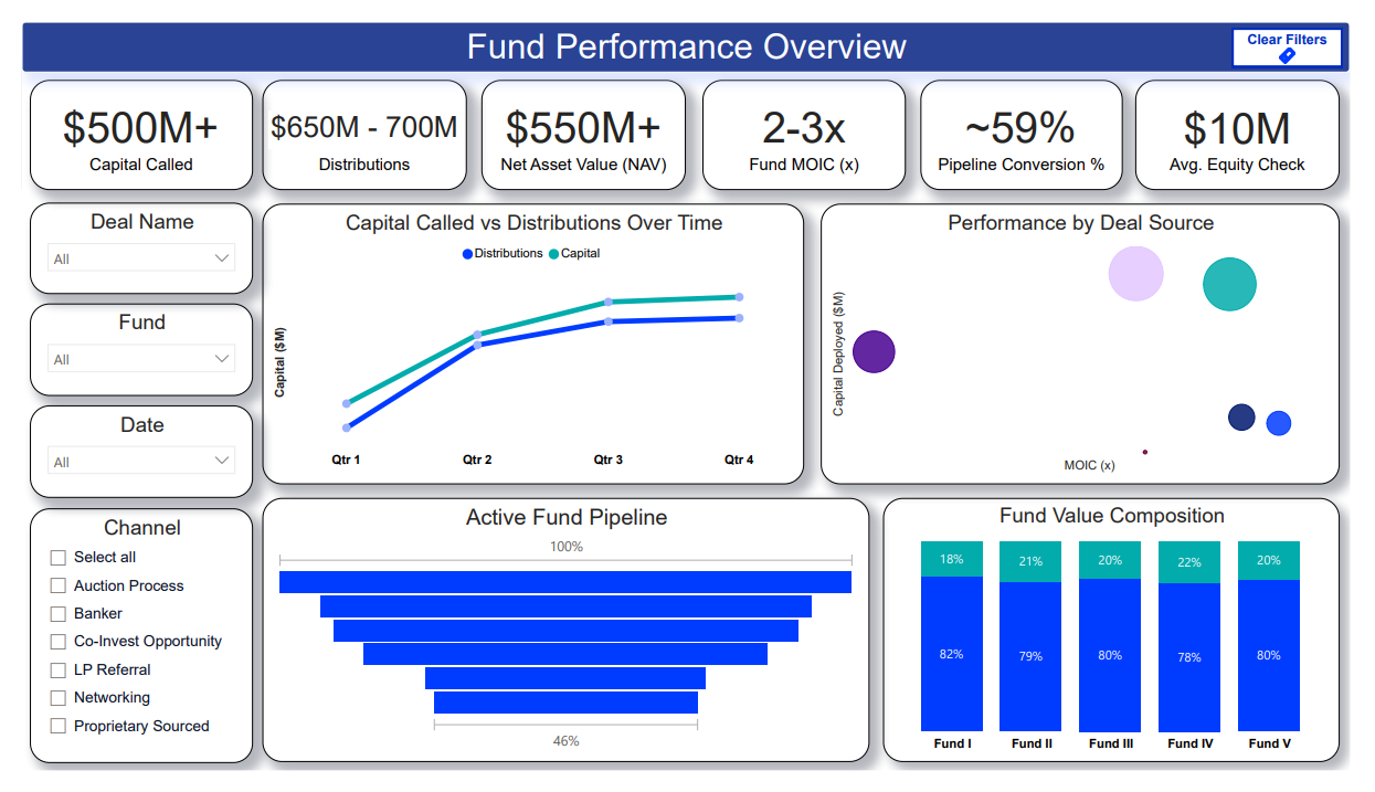 Dashboards that track portfolio KPIs and fundraising metrics in real-time.